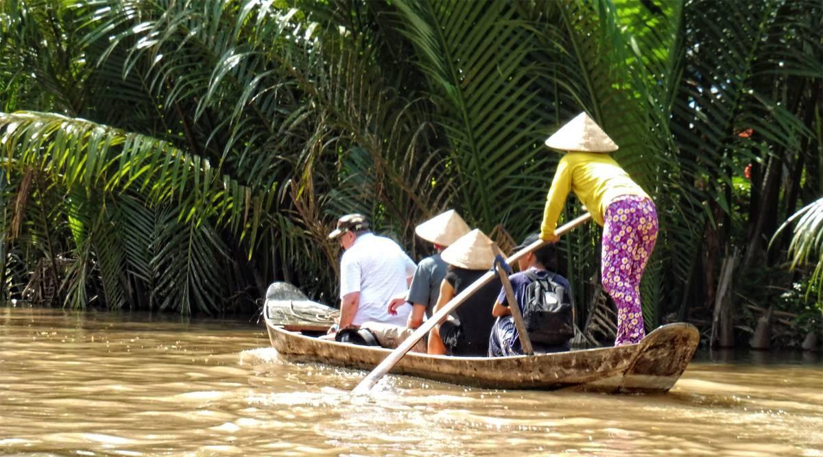 Na de lunch ga je per sampan roeien door de kleinere grachten van de Mekong.